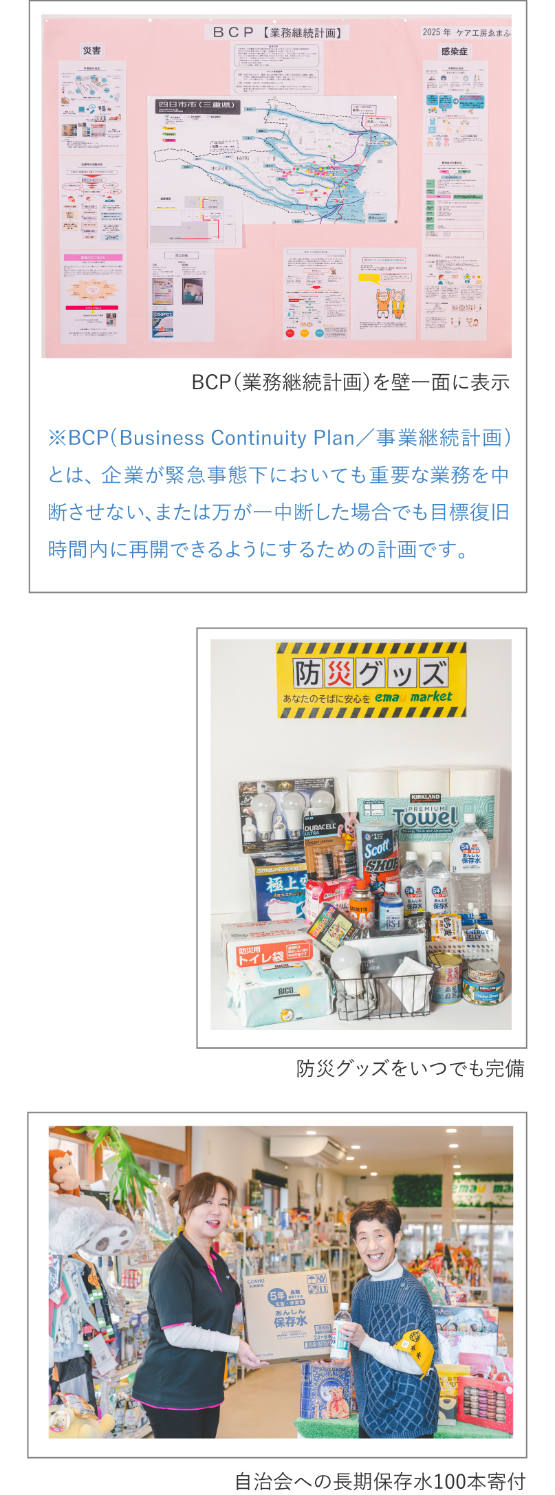 また、災害が多発する昨今、地域の生活インフラが途切れないための備えも重要であると考え、BCP(事業継続計画)の観点からローリングストックを目的としたコストコ再販店を運営し、平時・有事を問わず、生活物資が循環する仕組みづくりにも取り組んでまいりました。