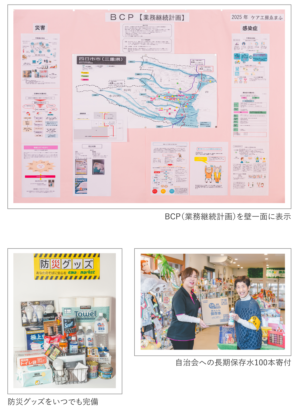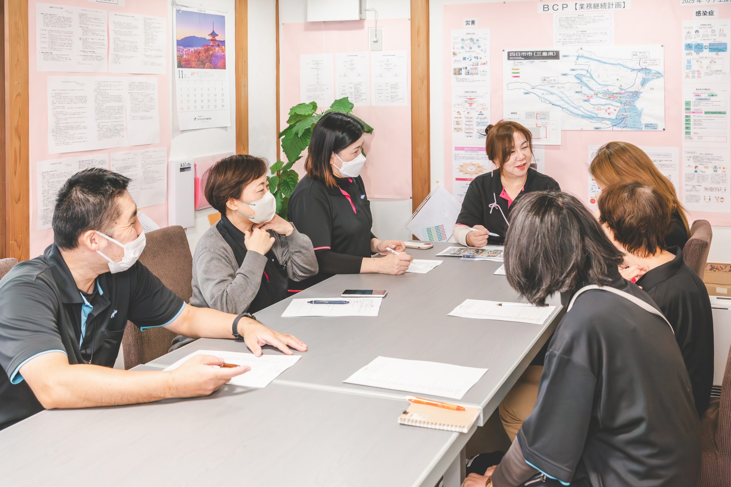 弊社では、自然災害や感染症まん延など不測の事態が発生した場合、従業員の安全を第一に、利用者様の介護支援を中断させない、または中断せざるを得なくなった場合は可能な限り短期間で事業を再開させるための方針・体制・手順を整えています。