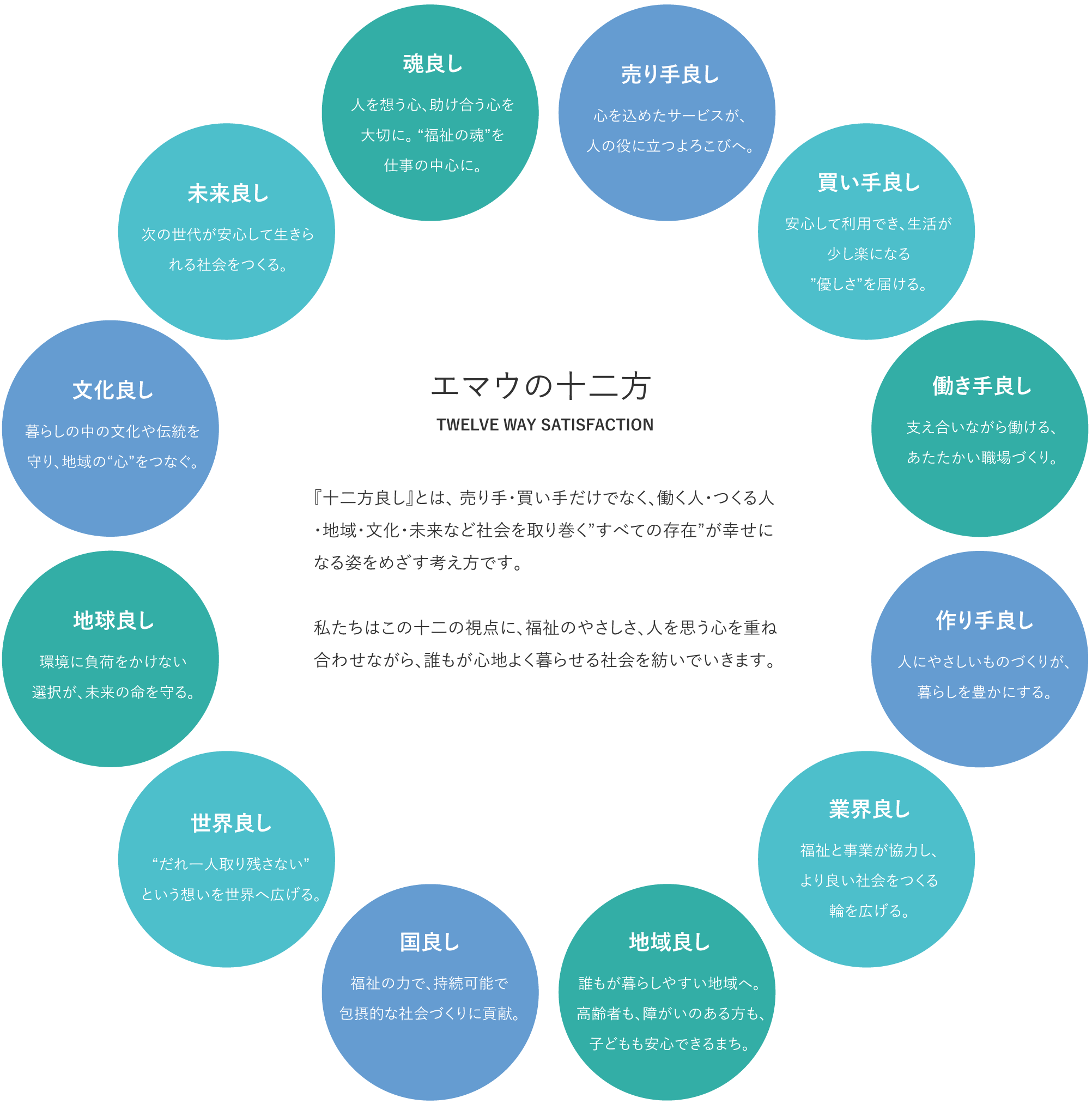 私たちはこの十二の視点に、福祉のやさしさ、人を思う心を重ね合わせながら、誰もが心地よく暮らせる社会を紡いでいきます。
