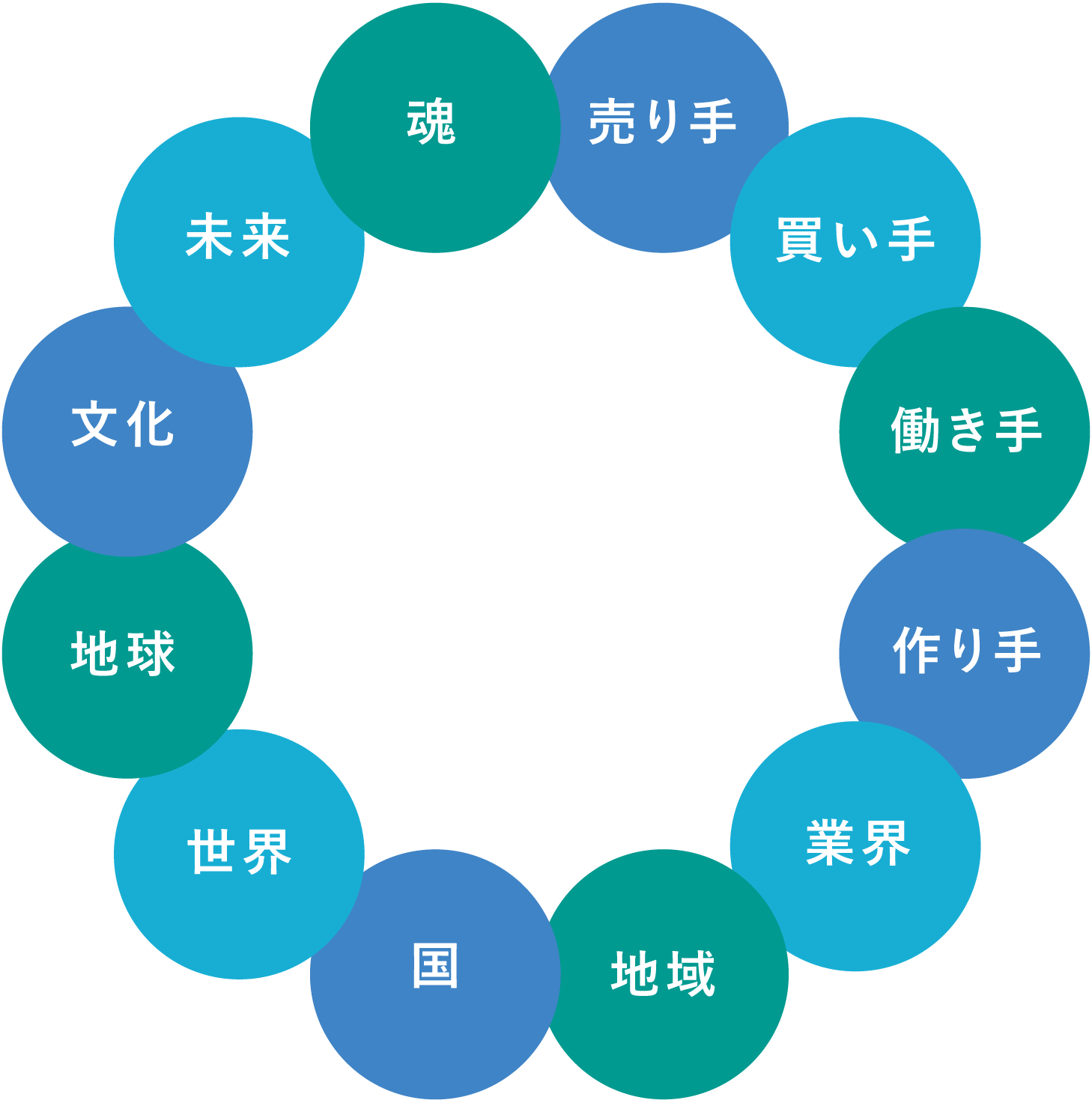『十二方良し』とは、 売り手・買い手だけでなく、働く人・つくる人・地域・文化・未来など社会を取り巻く”すべての存在”が幸せになる姿をめざす考え方です。